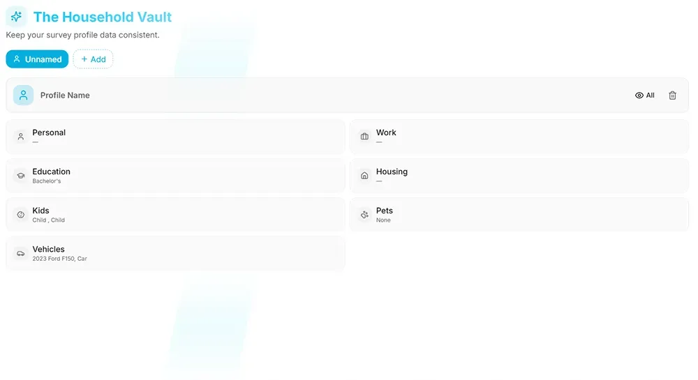 Consistency is key when applying for surveys and offers. The Household Vault acts as your "Household Survey Profile Manager," allowing you to maintain unlimited profiles to keep your data organized and morale high.